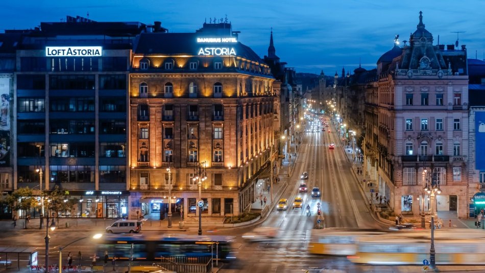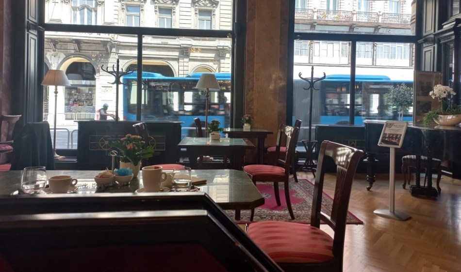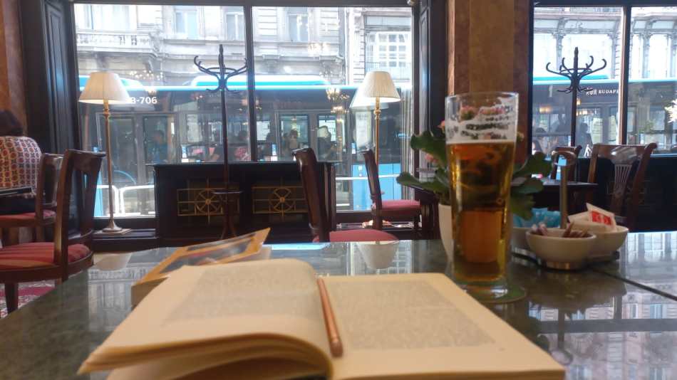 Unos metros más adelante de la librería me crucé con otro lugar memorable, que acaso haya sido el mejor al no haberlo tenido en el radar: el Café Astoria, que es el restaurante del Hotel Danubius Astoria, de más de cien años de vida. Ahí estuve ese jueves por la mañana, dando trámite al hábito de meterme a un café o cantina luego de pasar por una librearía de viejo, para pasar revista de lo adquirido acompañado de un café o de una cerveza.