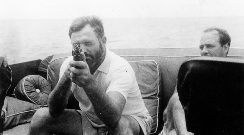 Al abrir La escuela de los duros de Norberto Fuentes es Ernest Hemingway el que aparece de inmediato, página 2, en una fantástica fotografía en blanco y negro en la que nos mira a través de la mirilla de un arma con la que nos apunta con una leve y gallarda sonrisa. Es la misma foto que aparece en la portada de la biografía de Mary V. Dearborn. La guapura de Hemingway es evidente. El ojo izquierdo lo tiene obviamente cerrado, el pelo es corto y algunas canas ya se asoman en su barba varonil.